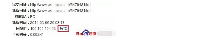 抓取診斷工具會(huì)檢查站點(diǎn)與百度的連接是否暢通,若站長發(fā)現(xiàn)IP信息還是老舊的,可以通過“報(bào)錯(cuò)”通知百度搜索引擎更新IP,如下圖所示: